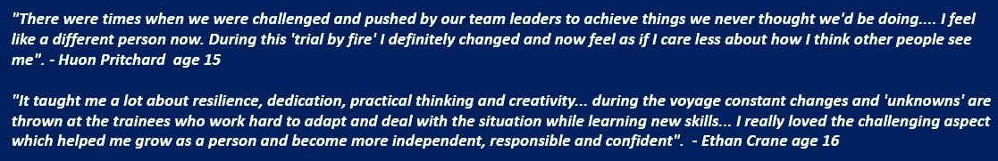 Image of previous voyage participants in program with quotation from Angus aged 14, voyage 9 2025 “Everyone should have the opportunity to do this it’s life changingly awesome”